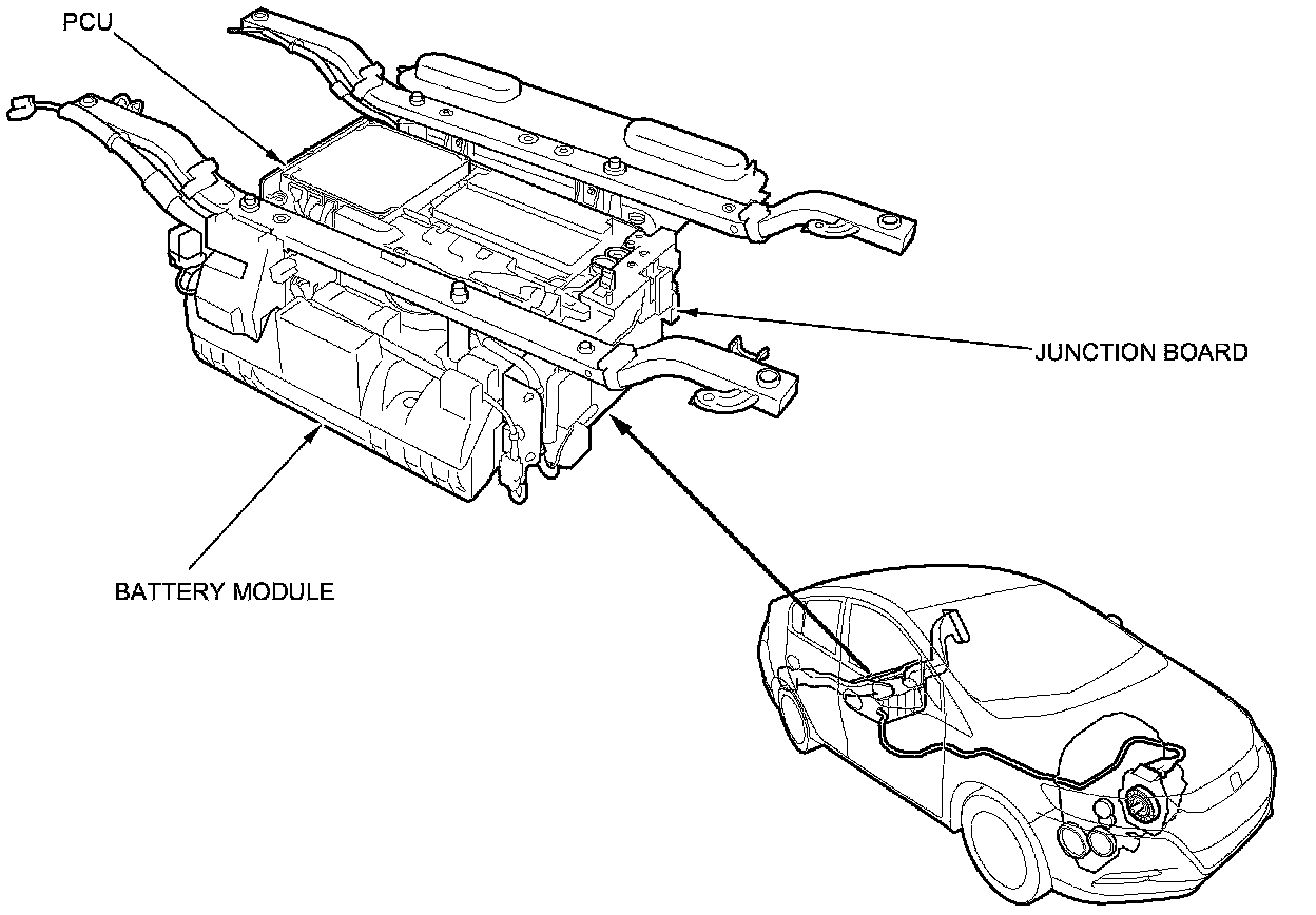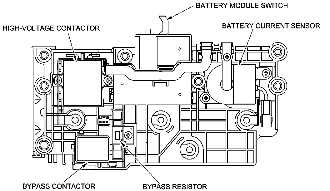 The junction board is mounted on the battery module, and it distributes high voltage energy within the IMA system. The junction board consists of a high-voltage contactor, a bypass contactor, a bypass resistor, a battery current sensor, a fuse and a battery module switch.