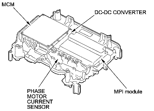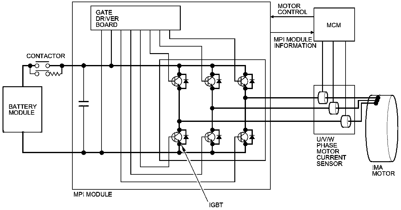The MCM controls the DC/AC conversion between the battery module 100 V DC to the 3-phase AC IMA motor.