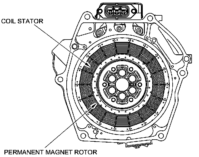 The IMA motor is located between the engine and the transmission. It consists of a 3-phase coil stator and a permanent magnet rotor that is directly connected to the engine crankshaft. An IMA motor rotor position sensor is mounted on the back of the engine block to detect the position of the rotor.