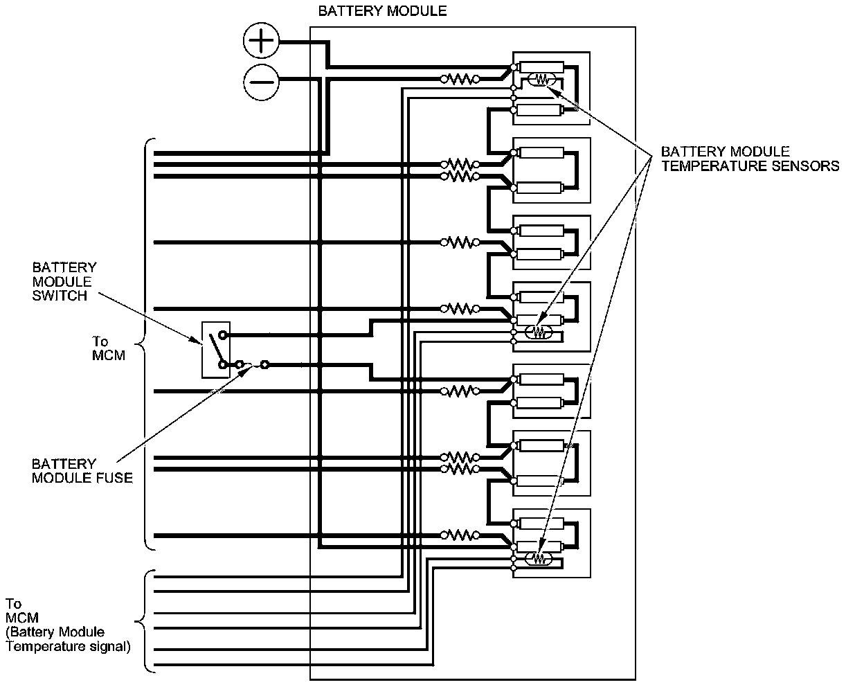 The battery module has three built-in thermistor temperature sensors to monitor battery temperature.