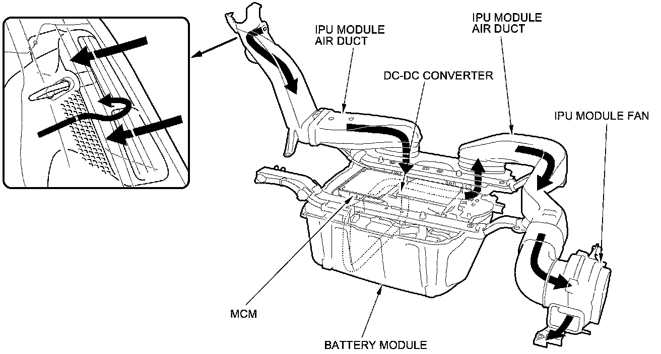 The battery module, the MPI module, and the DC-DC converter generate heat during assist/regeneration. The IPU is equipped with a fan to cool these parts, to assure proper battery performance, and to protect the system. The fan has a control circuit and rotation sensor that are controlled by the MCM. When the temperature of the battery module, the MPI module, or the DC-DC converter exceeds the specified value, the MCM operates the IPU module fan. The cooling air is drawn into the battery module from the left side of the rear seat, then it is exhausted into the cargo area through the MPI module heat sink and the DC-DC converter heat sink.