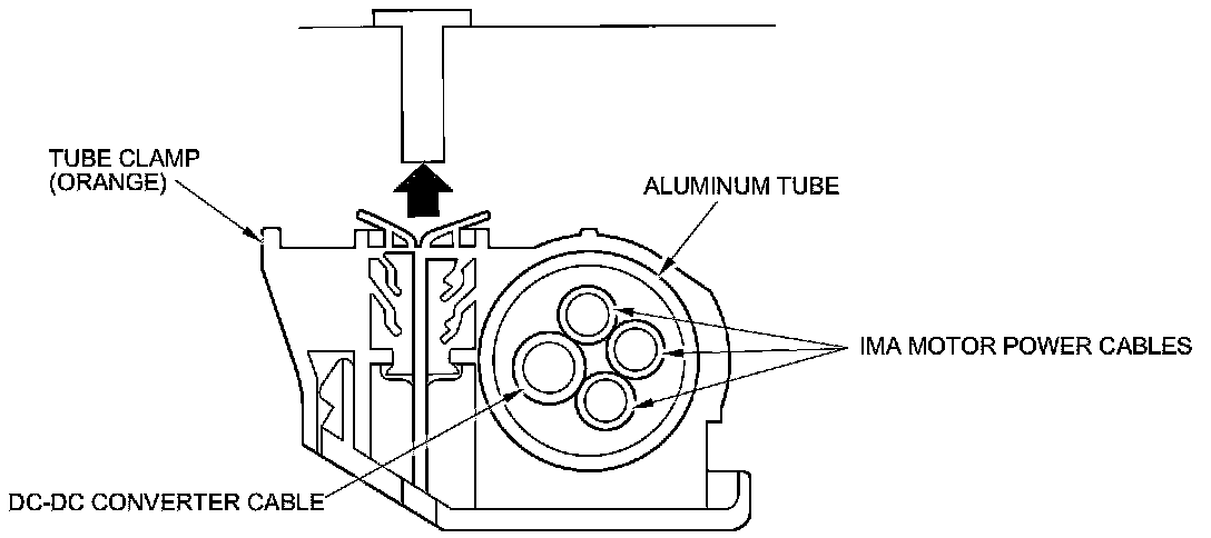 The IMA motor power cables connect the IMA motor to the MPI module. The cables feed through an aluminum tube for damage protection and to prevent electrical noise. The DC-DC converter cable is also contained inside the aluminum tube. The tube is attached to the underside of the vehicle by orange clamps.