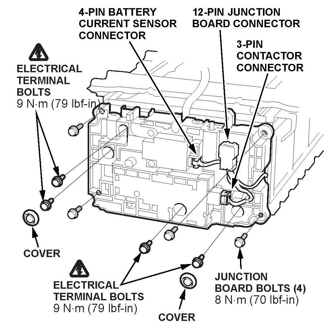 When the junction board is attached, no high voltage is accessible by the technician. However, the removal and replacement of the junction board will expose the technician to high voltage parts of the IMA battery that cannot be shut off.