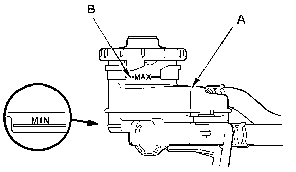 1. Make sure the brake fluid level in the reservoir (A) is at the MAX (upper) level line (B).