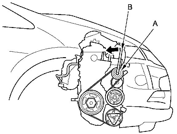1. Move the auto-tensioner (A) with a wrench (B) in the direction of the arrow to relieve tension from the drive belt, then remove the drive belt.