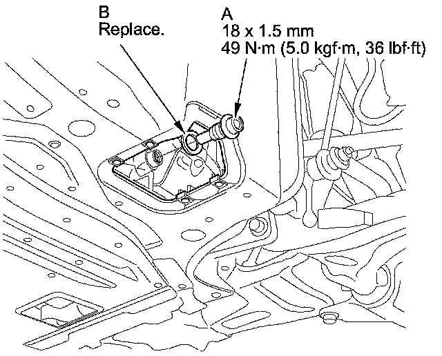 4. Remove the drain plug (A), and drain the CVT fluid (CVTF). Reinstall the drain plug with a new sealing washer (B).