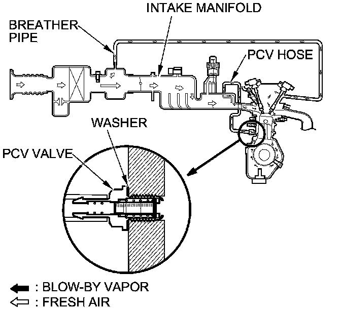 The PCV valve prevents blow-by gases from escaping into the atmosphere by venting them into the intake manifold.