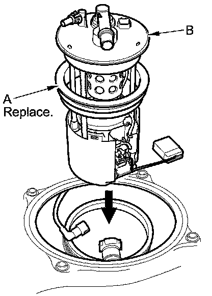 1. Temporarily attach a new base gasket (A) to the fuel tank unit (B), then insert the fuel tank unit partially into the fuel tank.