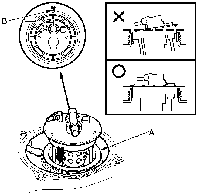 3. Align the marks (B) on the fuel tank and fuel tank unit, then insert the fuel tank unit into the fuel tank until the fuel tank unit rests on top of the base gasket.