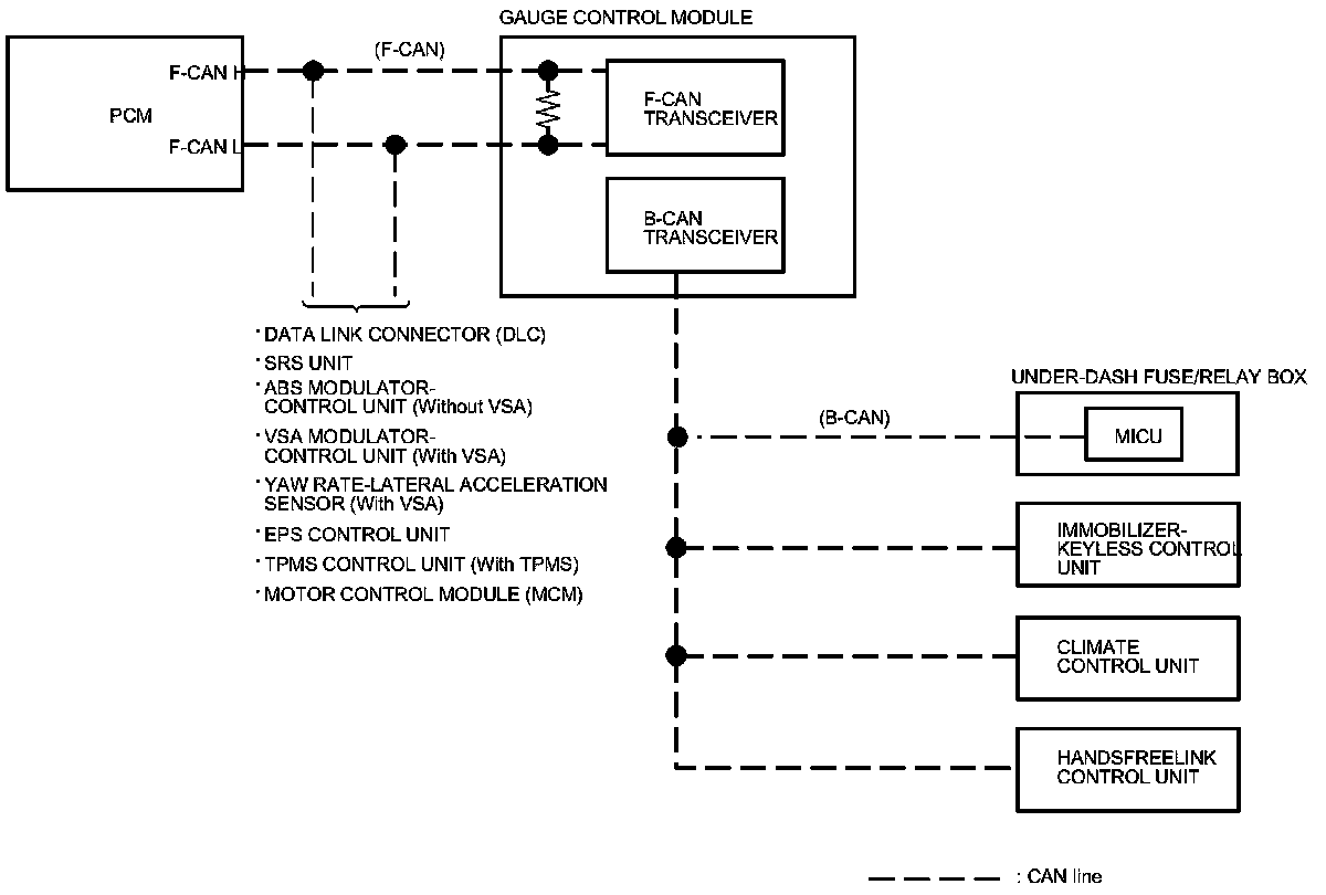 By connecting the HDS to the data link connector (DLC), the HDS can retrieve the diagnostic information from the MICU via a diagnostic line called the K-LINE. The K-LINE is a separate communication line from the CAN lines, but it is connected to most of the CAN related ECUs. The MICU is a gateway between the HDS and B-CAN related ECUs, and sends B-CAN diagnostic information to the HDS. When doing a function test with the HDS, the HDS sends an output signal through the K-LINE to the MICU. The MICU either relays the request to another ECU, or commands the function itself.