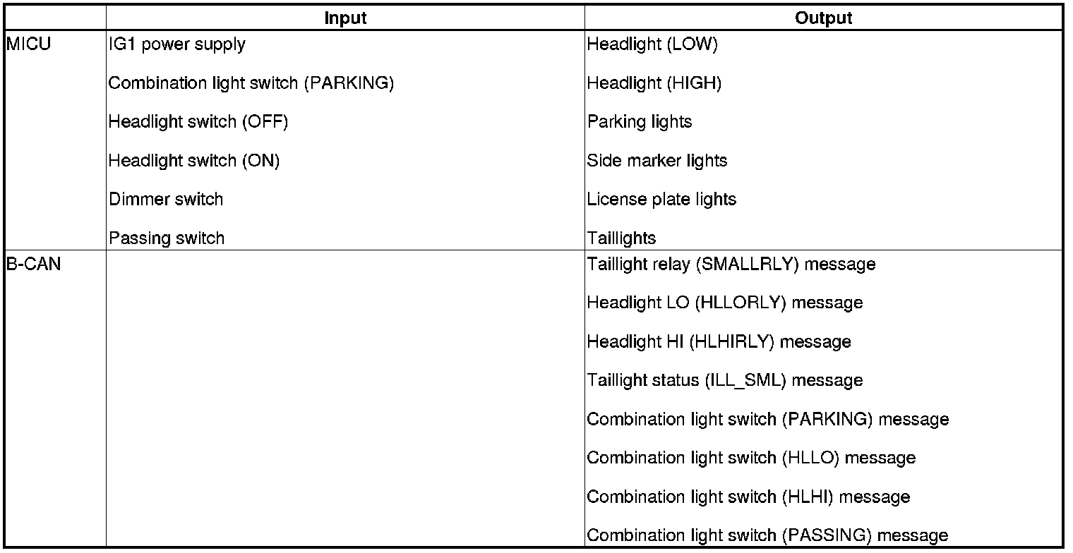 The MICU control of the headlights as daytime running lights is based on inputs from each switch and B-CAN data.