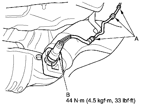 4. Remove the wire clips (A), then remove the secondary HO2S (B).