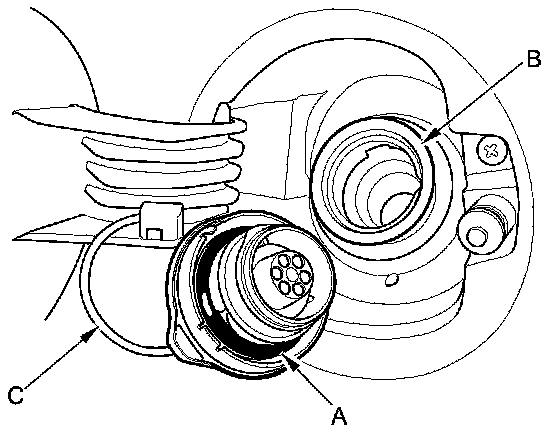 2. Check the fuel fill cap seal (A) and the fuel fill pipe mating surface (B). Verify that the fuel fill cap tether cord (C) is not caught under the cap.