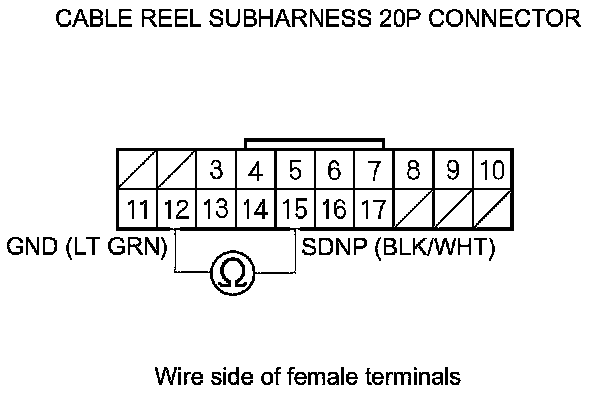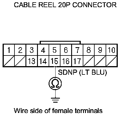 7. Check for continuity between cable reel 20P connector terminal No. 15 and body ground.