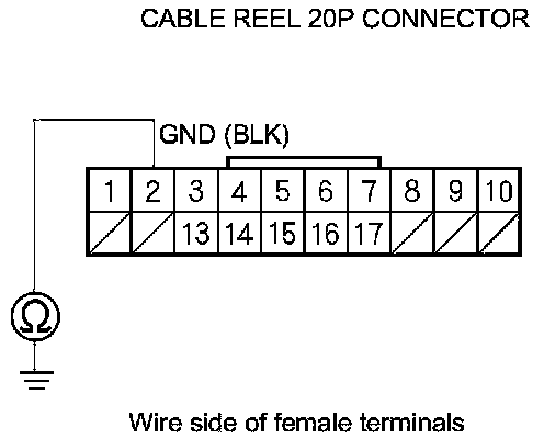 6. Check for continuity between cable reel 20P connector terminal No. 2 and body ground.
