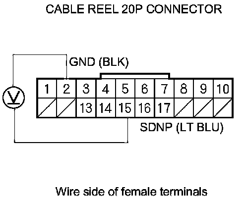 9. Measure the voltage between cable reel 20P connector terminals No. 2 and No. 15.