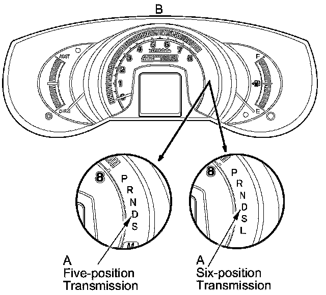 When the powertrain control module (PCM) senses an abnormality in the input or output system, the D indicator (A) in the gauge control module (B) will usually blink.