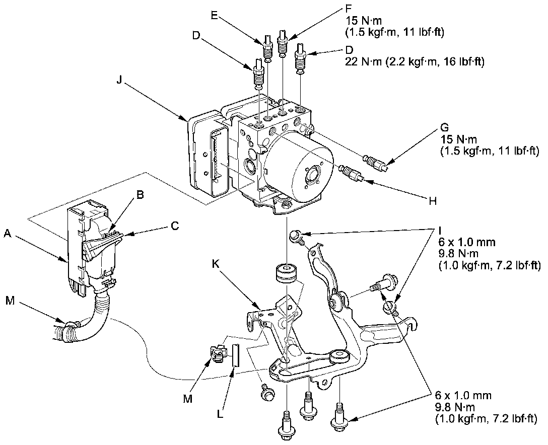 4. Remove the 6 x 16 mm flange bolt (I), then remove the VSA modulator-control unit (J) with the bracket (K) from the body.