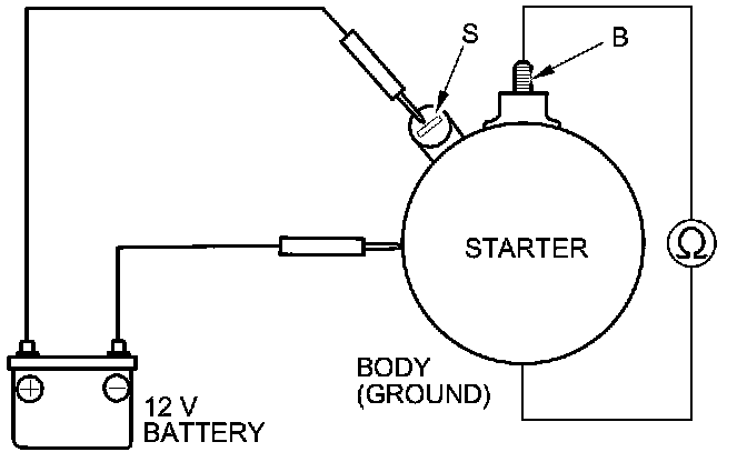 4. Connect the battery as shown, and check for continuity between the B terminal and the starter body. If there is continuity, it is working properly.