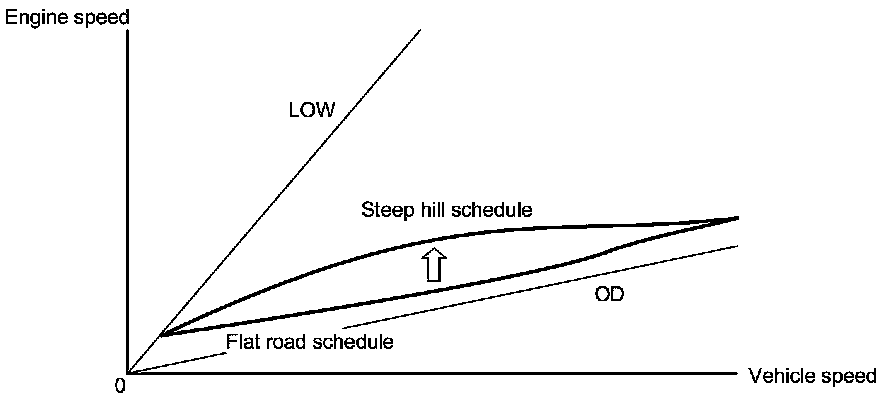 When the PCM determines that the vehicle is climbing a hill in the D and S positions, the system selects the most suitable shift schedule based on the steepness of the grade so the vehicle can run smoothly and have more power when needed.