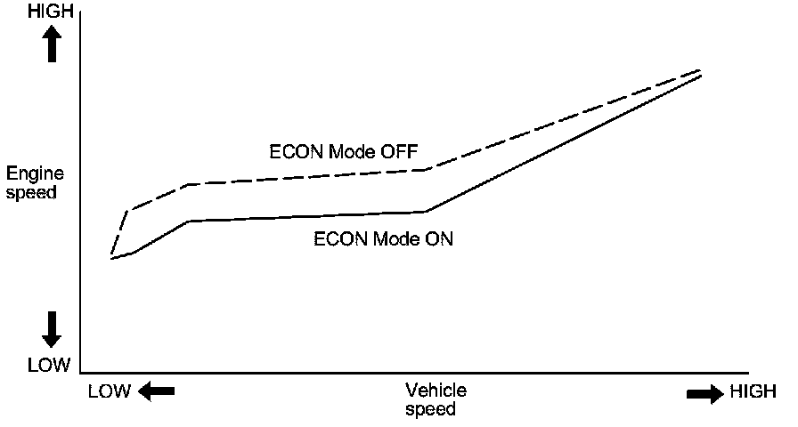 The CVT control system performs the following functions in the ECON Mode ON to improve fuel economy compared to ECON Mode OFF.