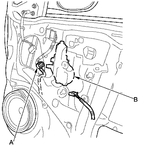 4. Disconnect the 2P connector (A) from the front passenger's power window motor (B).