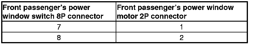 2. Test the motor in each direction by connecting battery power and ground to the front passenger's power window switch 8P connector according to the table.
