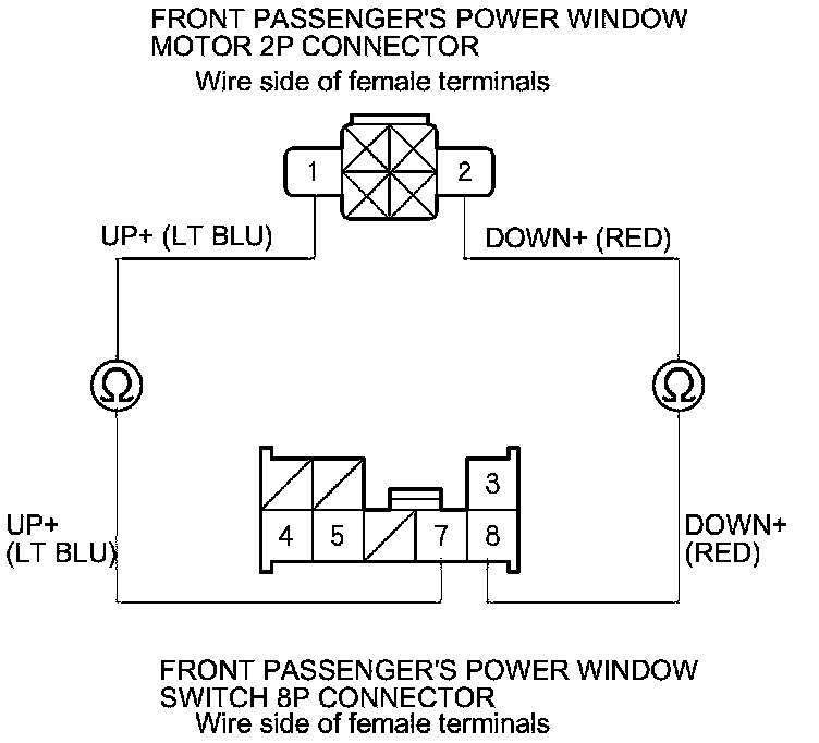 5. Check for continuity between the front passenger's power window switch 8P connector terminals and the front passenger's power window motor 2P connector terminals as shown. There should be continuity.