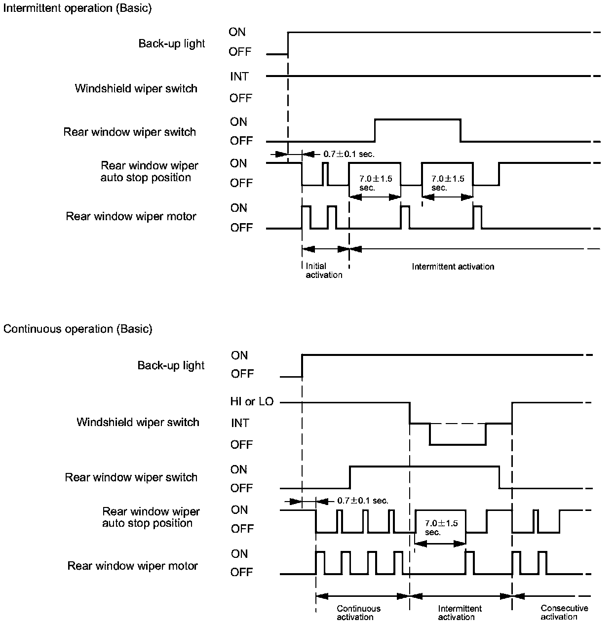 When the shift lever is shifted to R with the windshield wiper activated, the rear window wiper operates automatically even if the rear window wiper switch is off.
