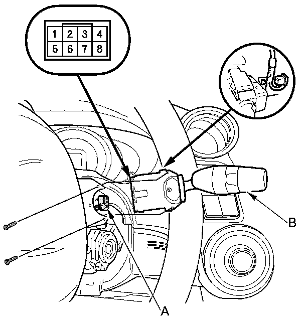2. Disconnect the dashboard wire harness 8P connector (A) from the wiper/washer switch (B).