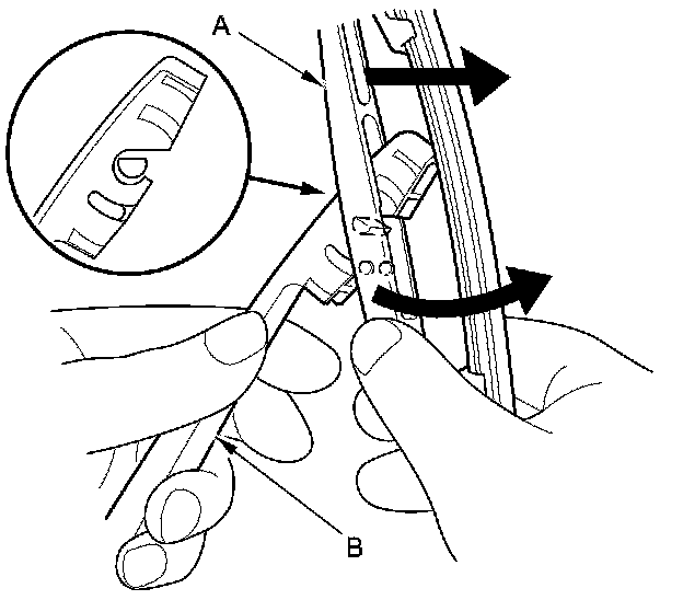 3. Align the groove (A) of each rail (B) with the tabs in a new wiper blade (C), then install the wiper blade and the rails into the blade holder in the reverse order of removal.