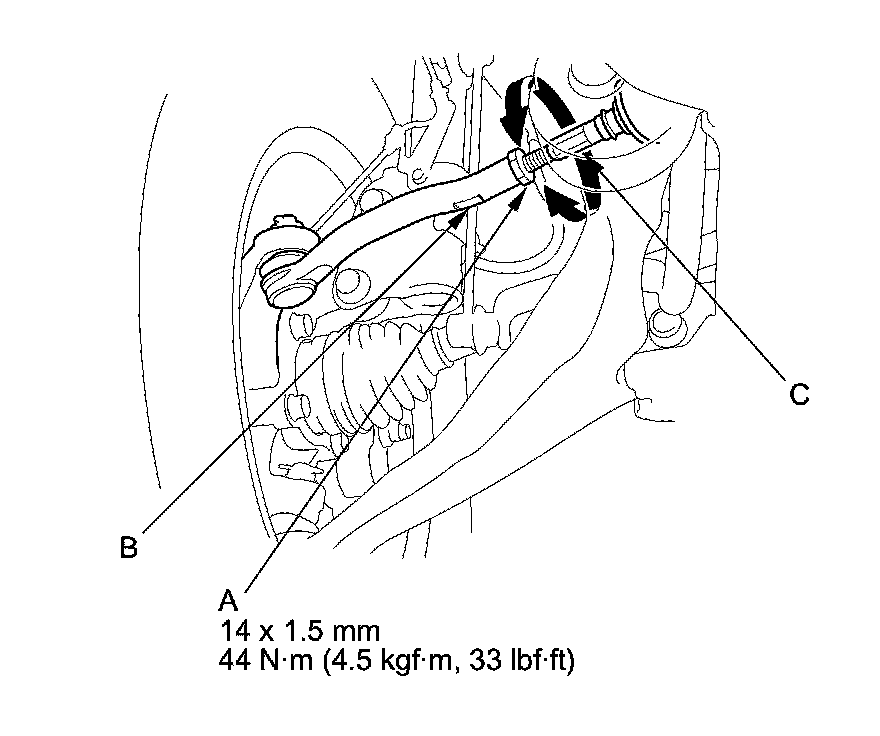3. Loosen the tie-rod locknuts (A) while holding the flat surface sections (B) of the tie-rod end with a wrench, and turn both tie-rods (C) until the front toe is within specifications.