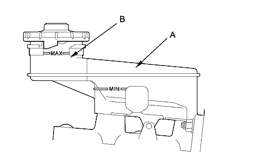 1. Make sure the brake fluid level in the reservoir (A) is at the MAX (upper) level line (B).