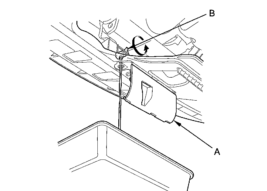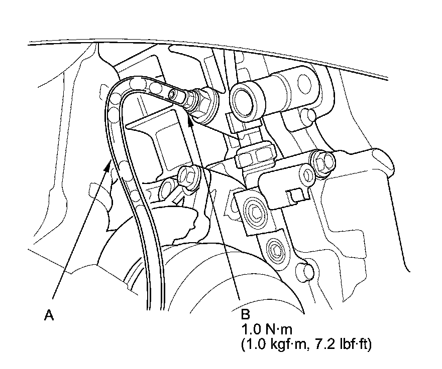 5. Install a rubber hose (A) on the drain bolt (B) located at the rear of the engine block, then loosen the drain bolt.