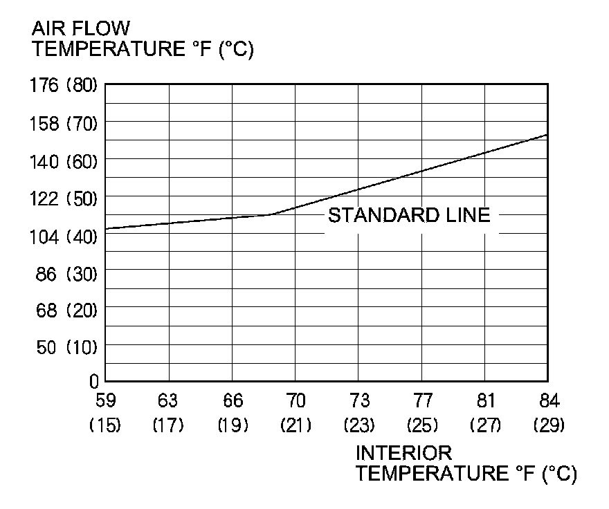 24. Set the climate control or HVAC control unit to maximum heat, and select high speed heat mode on the rear control panel. Measure the temperature of the air from the rear floor vent for 3 minutes. Make sure the temperature is above the standard line of the graph as shown. If the temperature is below the standard line, repeat steps 18 through 21 several more times. Then loosely install the radiator cap and recheck.
