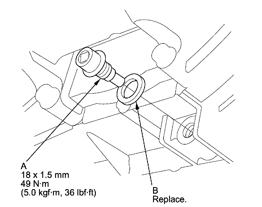 7. Install the ATF filler bolt (B) and a new sealing washer (C).