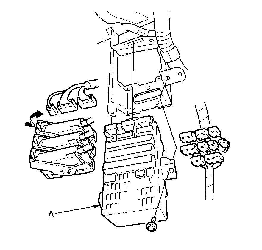 3. Disconnect the connectors from the fuse side of the under-dash fuse/relay box (A).