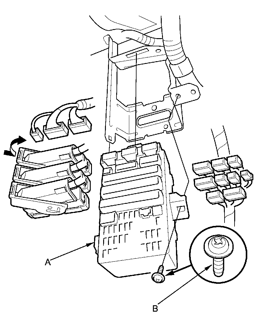 4. Remove the mounting one-way screw (B), and pull the under-dash fuse/relay box away from the body.