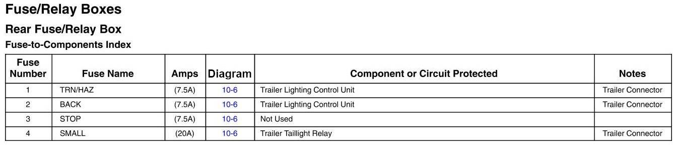 Rear Fuse/Relay Box - Fuse-to-Components Index