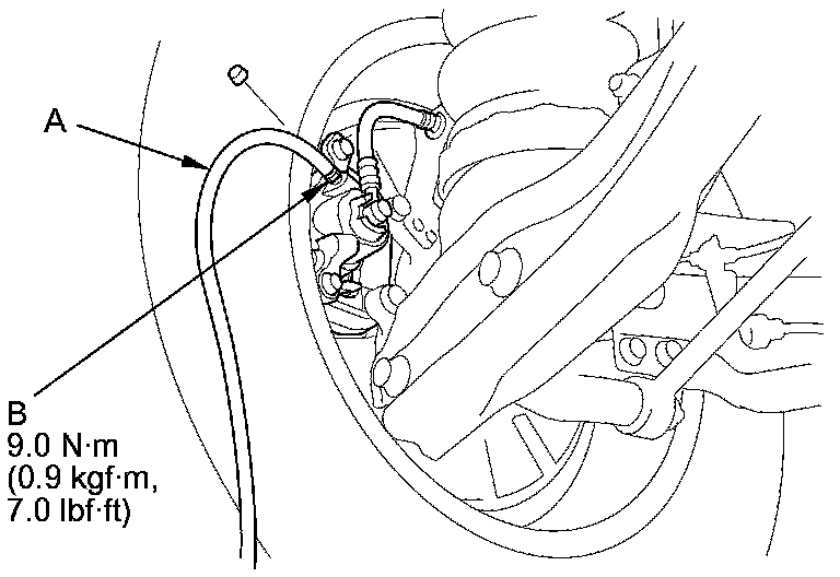 4. Attach a length of clear drain tube (A) to the bleed screw (B), then loosen the bleed screw to allow air to escape from the system. Then tighten the bleed screw securely.