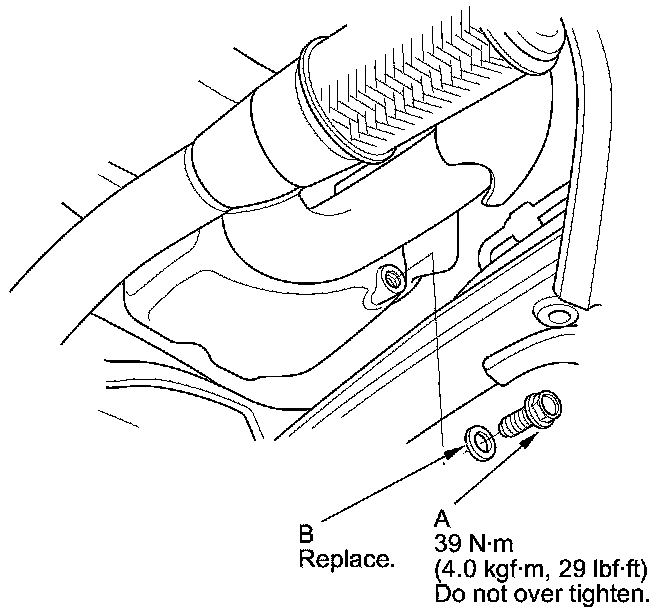 3. Reinstall the drain bolt with a new washer (B).