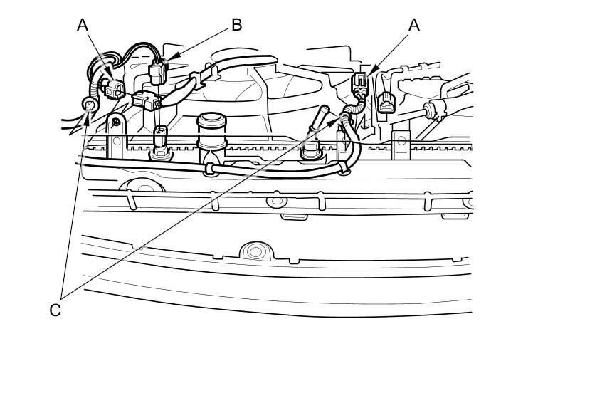 9. Disconnect the fan motor connectors (A) and the ECT sensor 2 connector (B), then remove the harness clamps (C).