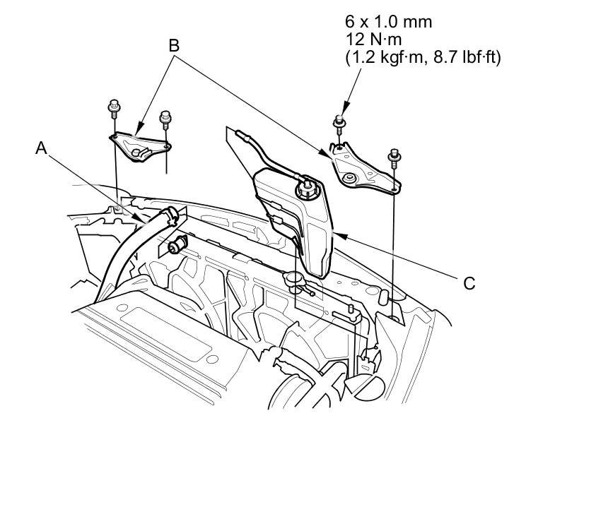 10. Disconnect the upper radiator hose (A) and remove the upper brackets (B) and the coolant reservoir (C).