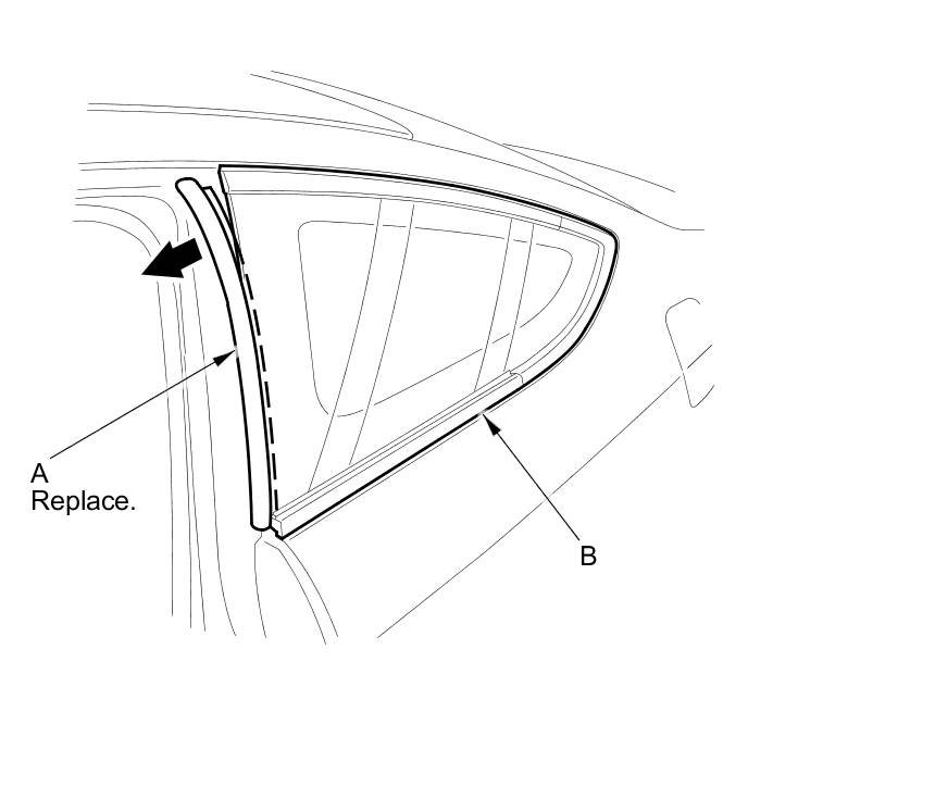 2. Remove the front seal (A) from the front edge of the quarter glass (B). If necessary, cut the seal with a utility knife.