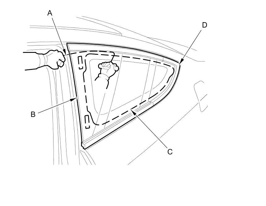 5. With a helper on the outside, pull the piano wire (A) back and forth in a sawing motion. Hold the piano wire as close to the quarter glass (B) as possible to prevent damage to the body, and carefully cut through the adhesive (C) in the straight area and the front corners, but not the rear corner (D).