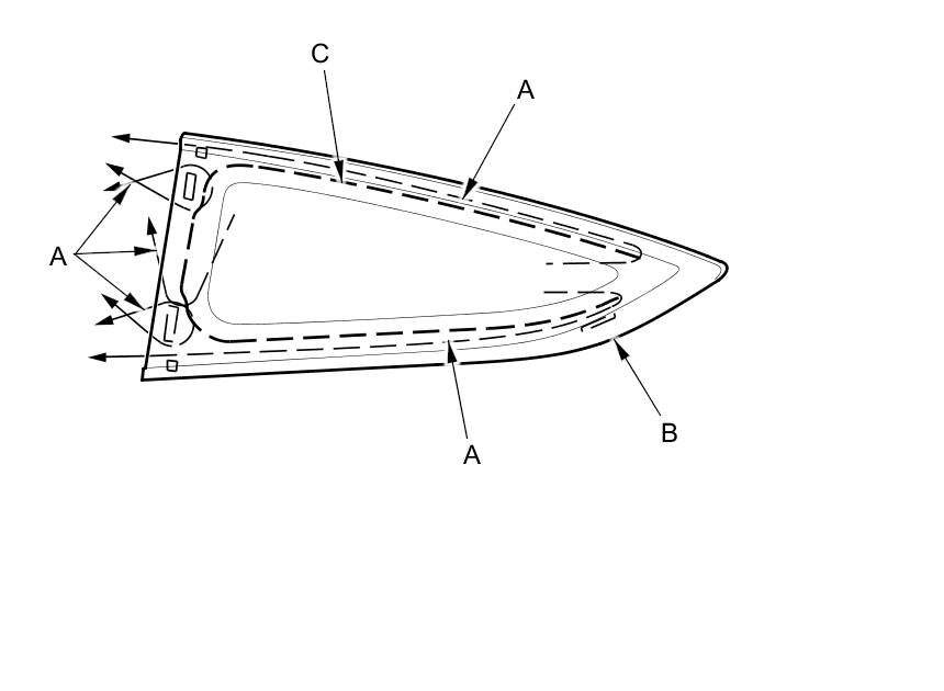 16. Put the cartridge in a caulking gun, and run a continuous bead of the adhesive (A) around the edge of the quarter glass (B) and along the front seal (C) as shown:
