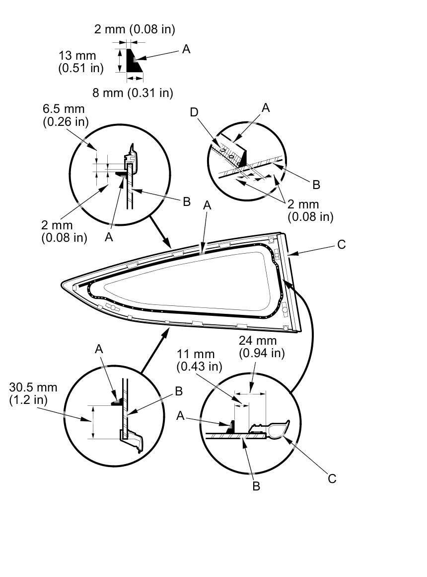 - Use the printed dots (D) on the quarter glass as a guide, apply the adhesive to the rear corner, upper corner and the lower corner area of the quarter glass.
