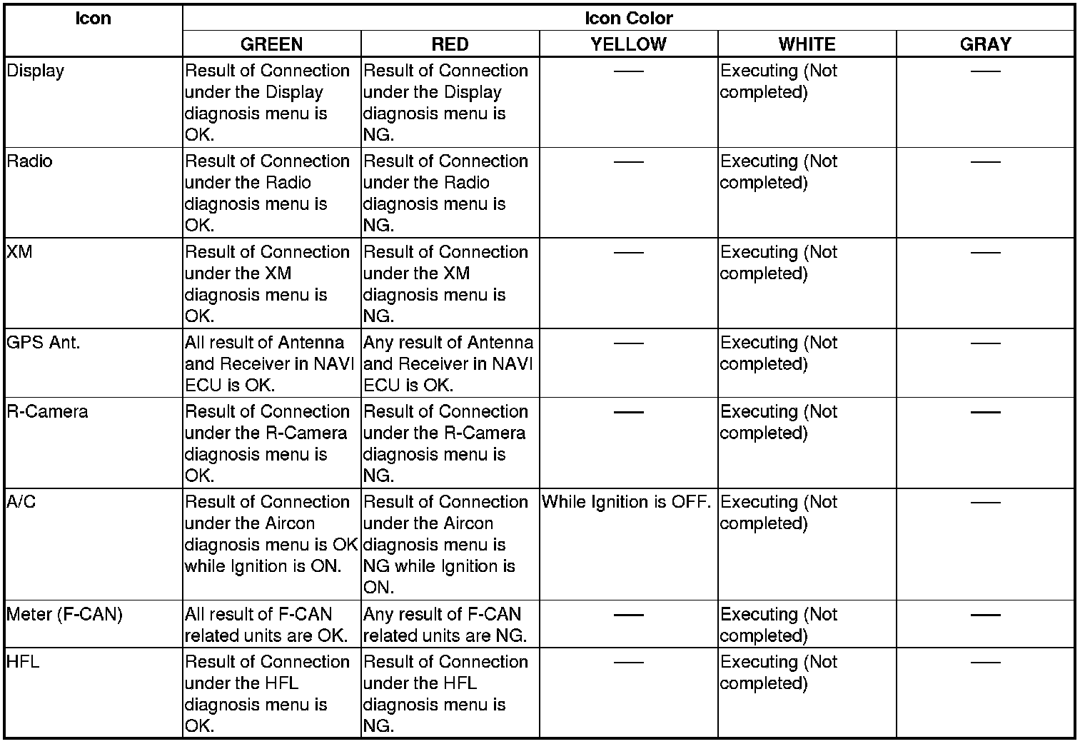 - If ROM or RAM shows NG, replace the navigation display unit Service and Repair.