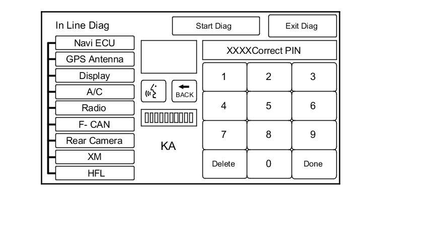 1. Enter this screen by connecting the SCS service connector or by selecting Self-Diagnosis Mode from the navigation screen main menu. The message at the bottom of the screen flashes indicating the diagnosis is running. Make sure you enter the audio anti-theft code.