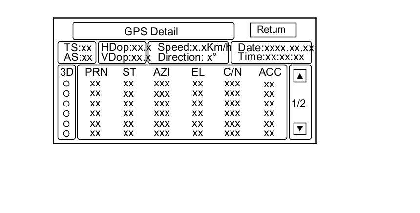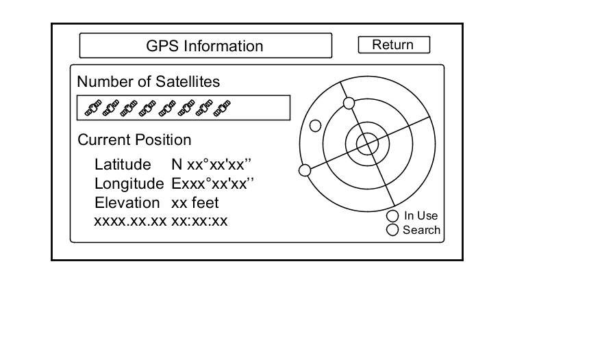 By pressing and holding the MENU button for 2 seconds, a GPS Detail screen appears. This screen displays real time incoming satellite positional data when the vehicle is outside in the open. The information shown on this screen is for factory use.